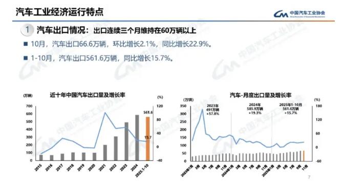 近日,中国汽车工业协会发布的最新数据显示:我国新能源汽车出口首超200万辆。1-10月汽车出口561.6万辆,同比增长15.7%。