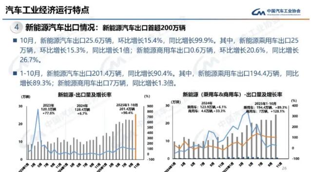 数据显示,10月份我国新能源汽车出口25.6万辆,环比增长15.4%,同比增长99.9%。其中,新能源乘用车出口25万辆,环比增长15.3%,同比增长1倍;新能源商用车出口0.6万辆,环比增长20.6%,同比增长26.7%。